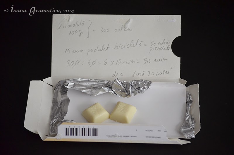 Daca o ciocolata de 100 grame are aproximativ 300 calorii, ca sa le arzi ar trebui sa pedalezi pe bicicleta aproximativ 1 ora si 30 minute.