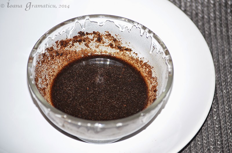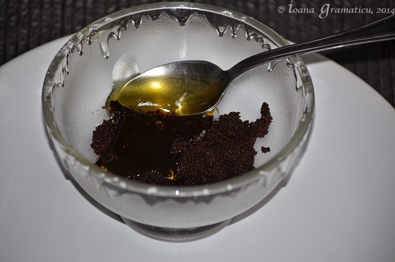Zatul de la o singura cafea ajunge pentru o masca. Le amesteci. Speli fata cu apa si sapun si apoi intinzi scrubul pe fata. Masezi usor, dar vorba Alinei "nu exagera ca-ti irita pielea".